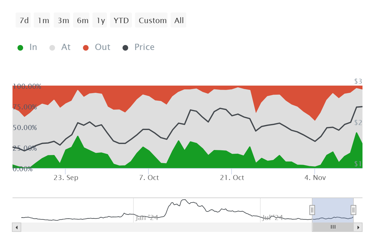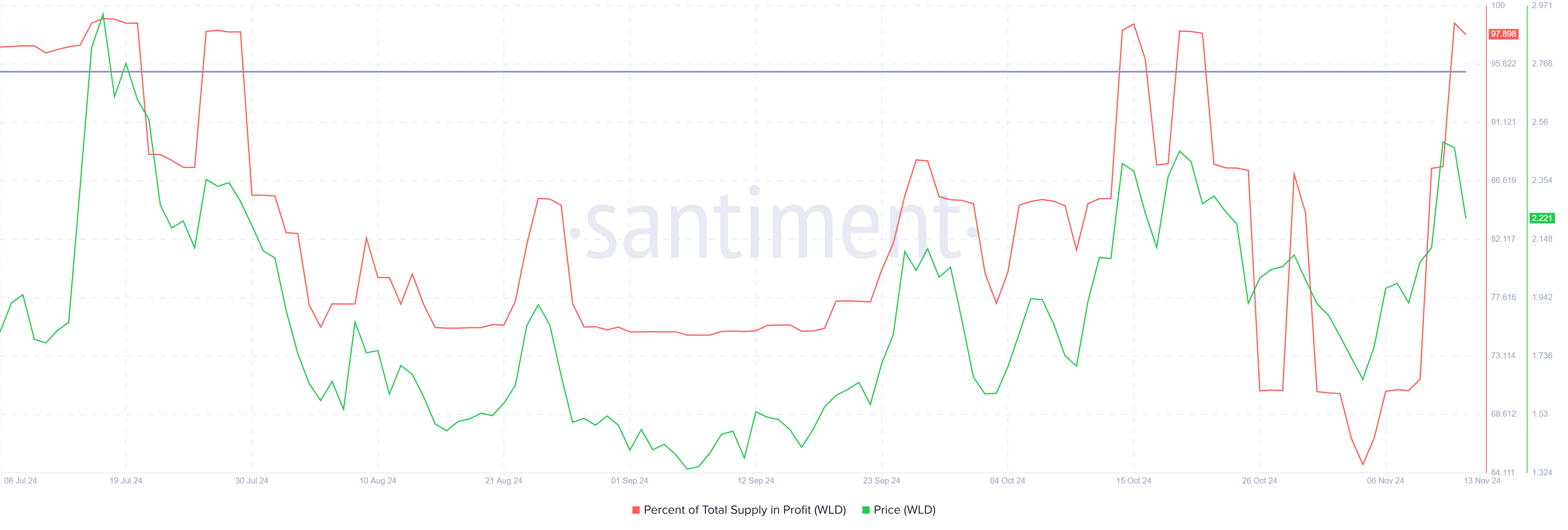 I skrivende stund er 97 % av den totale forsyningen av Worldcoin lønnsom, noe som vanligvis indikerer en markedstopp. Når mer enn 95 % av en kryptovalutas forsyning blir lønnsom, viser historiske trender at veksten ofte stopper opp, noe som øker potensialet for en prisreversering. Dette scenarioet reflekterer et vanlig mønster der gevinstsikring øker, noe som fører til potensielle korreksjoner. For Worldcoin tyder dette høye lønnsomhetsnivået på en potensiell prisnedgang ettersom innehavere ser ut til å sikre gevinster.