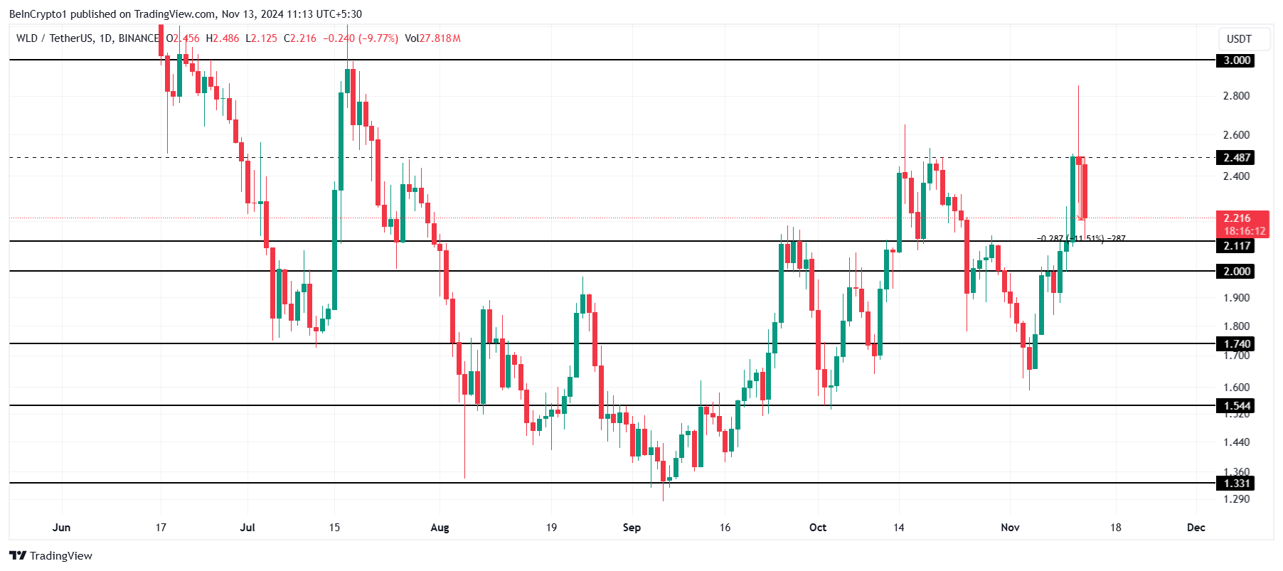 Men etter å ha nådd et nøkkelmotstandsnivå som har holdt den tilbake i tre måneder, stoppet altcoinens momentum opp, noe som førte til et prisfall på 11 % i løpet av de siste 24 timene. Denne motstanden har vist seg å være utfordrende, og utløser det som ser ut til å være en markedstopp for WLD.