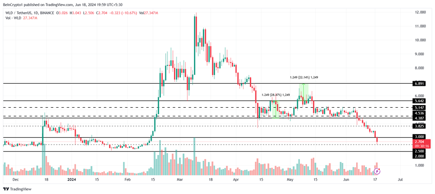 Worldcoins pris falt under et avgjørende støttenivå på $3. Den pågående korreksjonen de siste to dagene har resultert i et fall på 45 % fra $4,5. Hvis WLD-investorene flytter for å legge til flere tokens til beholdningene sine, kan altcoin ta tilbake $ 3 som støtte.