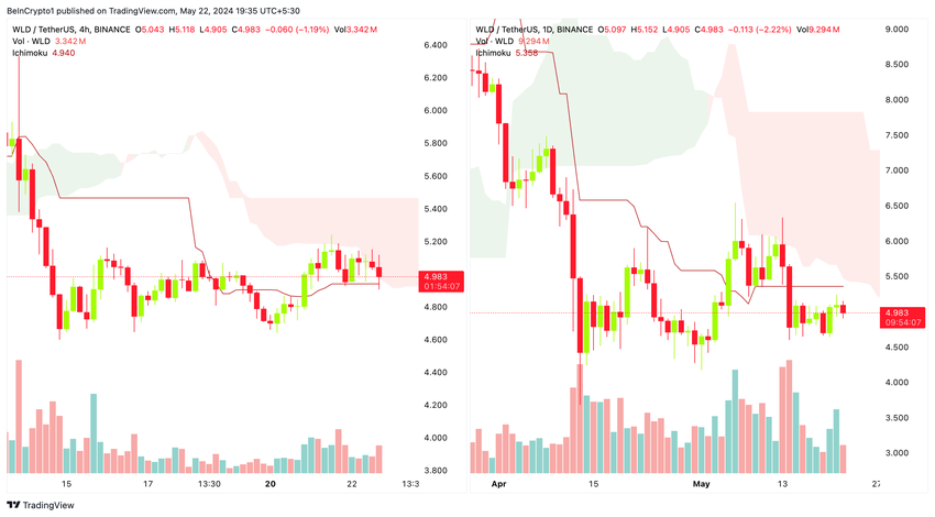 [I] vår tidligere WLD-analyse: Worldcoin (WLD) sliter under det kritiske motstandsnivået på 5,50 dollar. Den viser tegn på svakhet etter at den ikke klarte å trenge gjennom den daglige Ichimoku-skyen. Dette bearish sentimentet har ført til omfattende tap blant innehavere, med kortsiktige tradere som går ut for å redusere tapene sine.