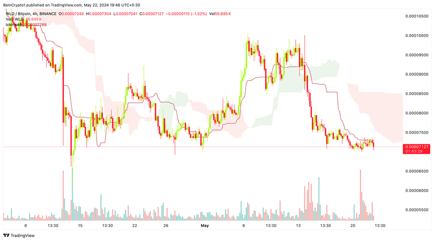 Prisen på WLD mot BTC er for tiden under 4-timers Ichimoku Cloud. Imidlertid kan et brudd over Tenkan-linjen (i rødt) utløse en pris reversering til oppsiden.