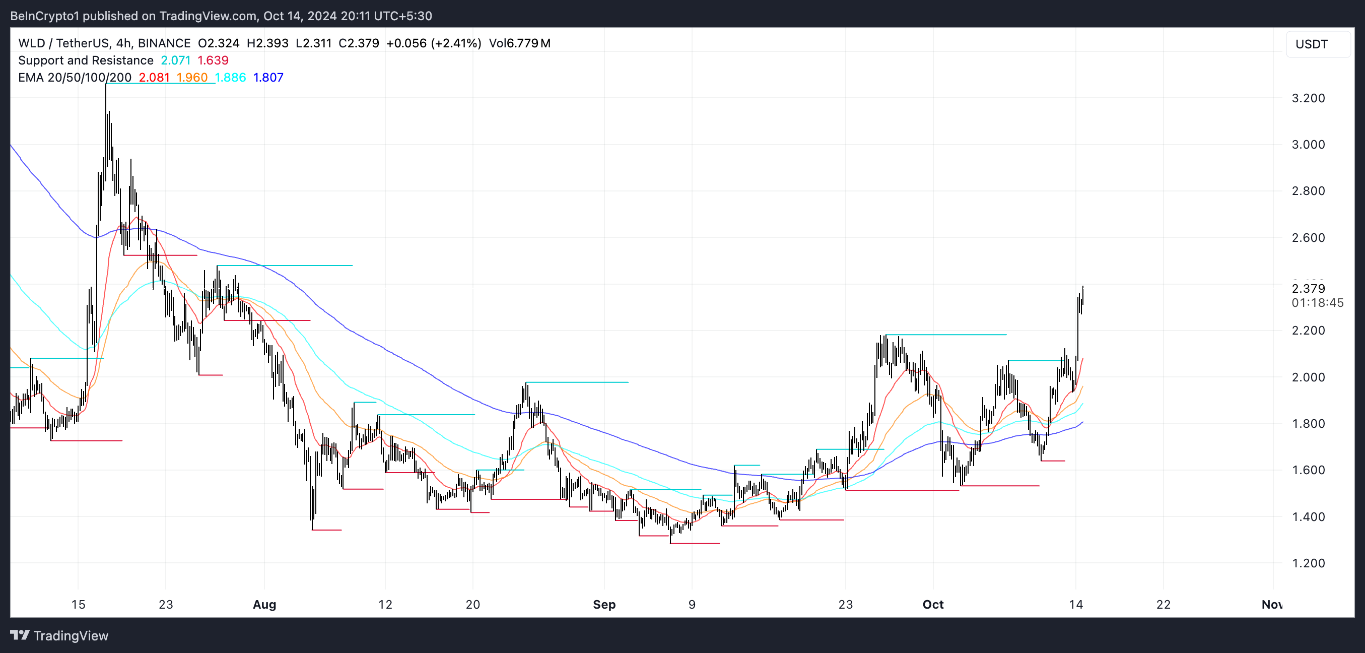 WLD ser for øyeblikket ekstremt bullish ut, med alle kortsiktige EMA-linjer plassert godt over de langsiktige, og store avstander mellom disse glidende gjennomsnittene. Denne justeringen signaliserer sterk oppadgående momentum og hype rundt kunstig intelligens coins.