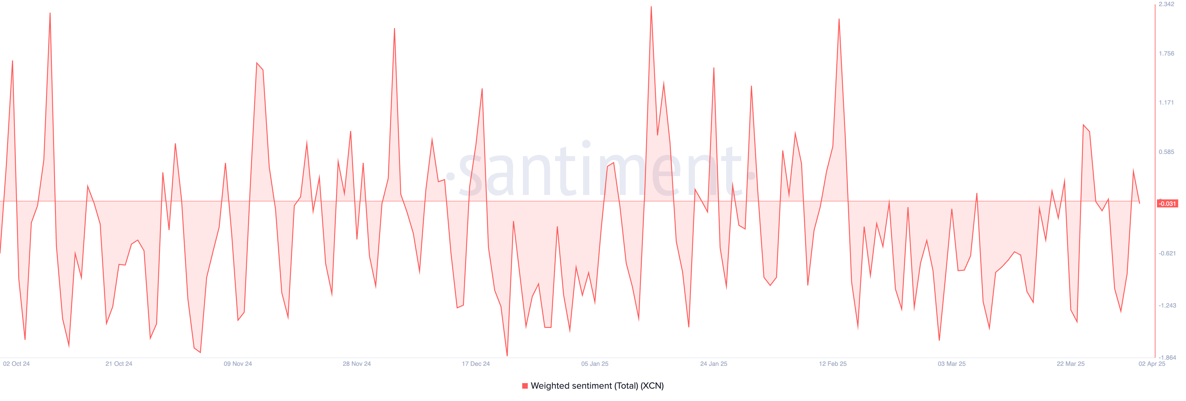 XCNs sterkt negative vektede sentiment siden midten av februar forsterker mangelen på tillit til dens prisoppgang. I skrivende stund står målingen under null på -0,031.