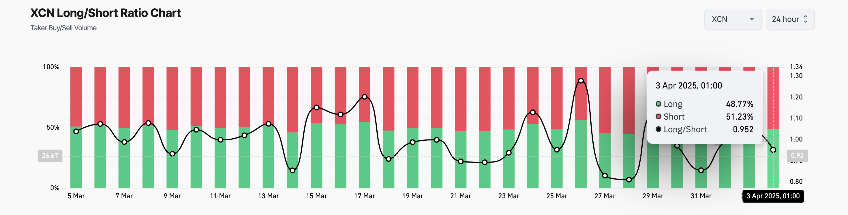 Videre bekrefter tokenets long/short-forhold dette negative utsiktene. På presstidspunktet er det 0,95, noe som reflekterer den høye etterspørselen etter short-posisjoner blant XCNs derivattradere.