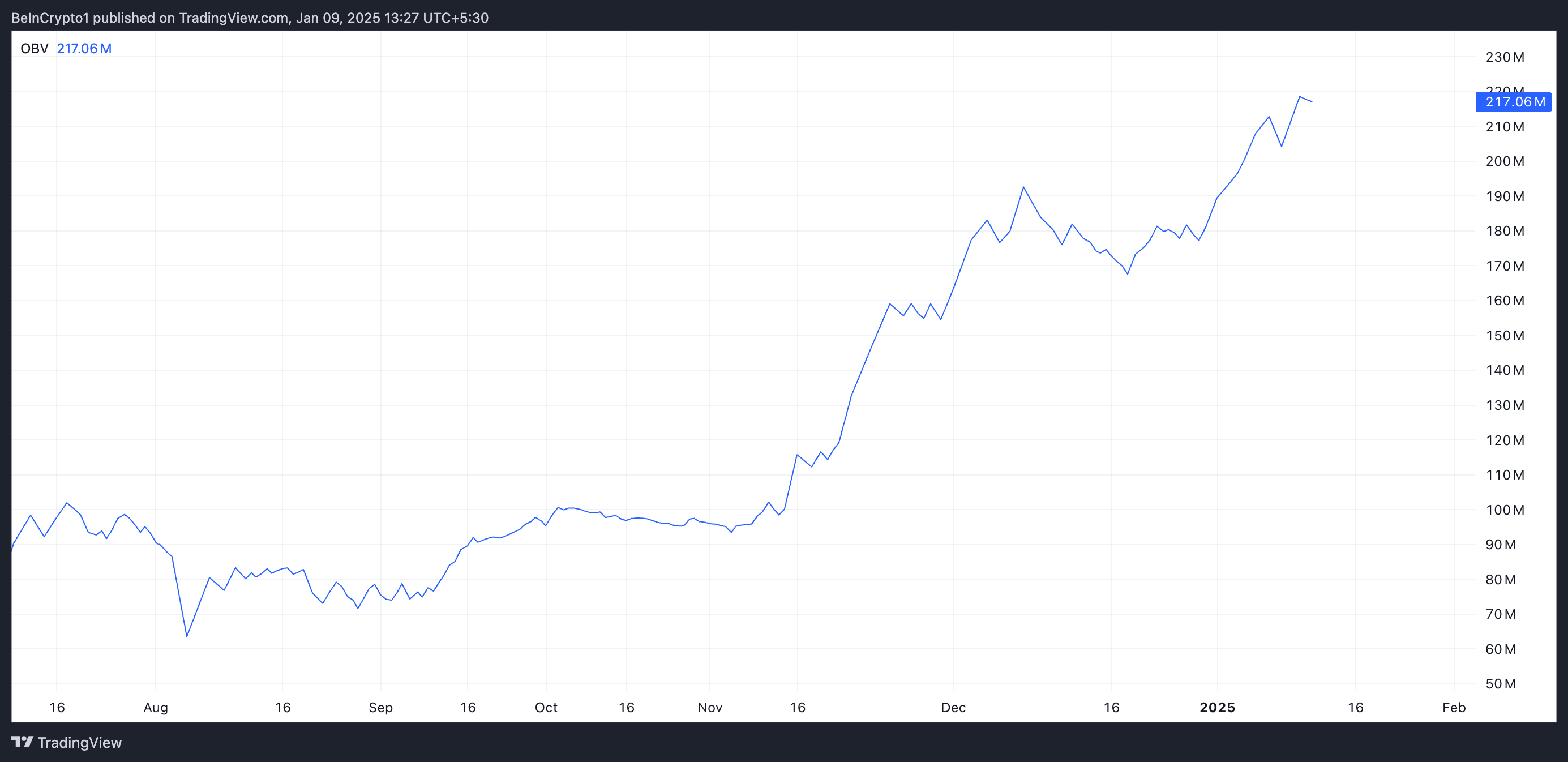 Når en aktivas OBV stiger slik, antyder det sterk kjøpsinteresse, ofte som et signal om en fortsettelse av en opptrend.