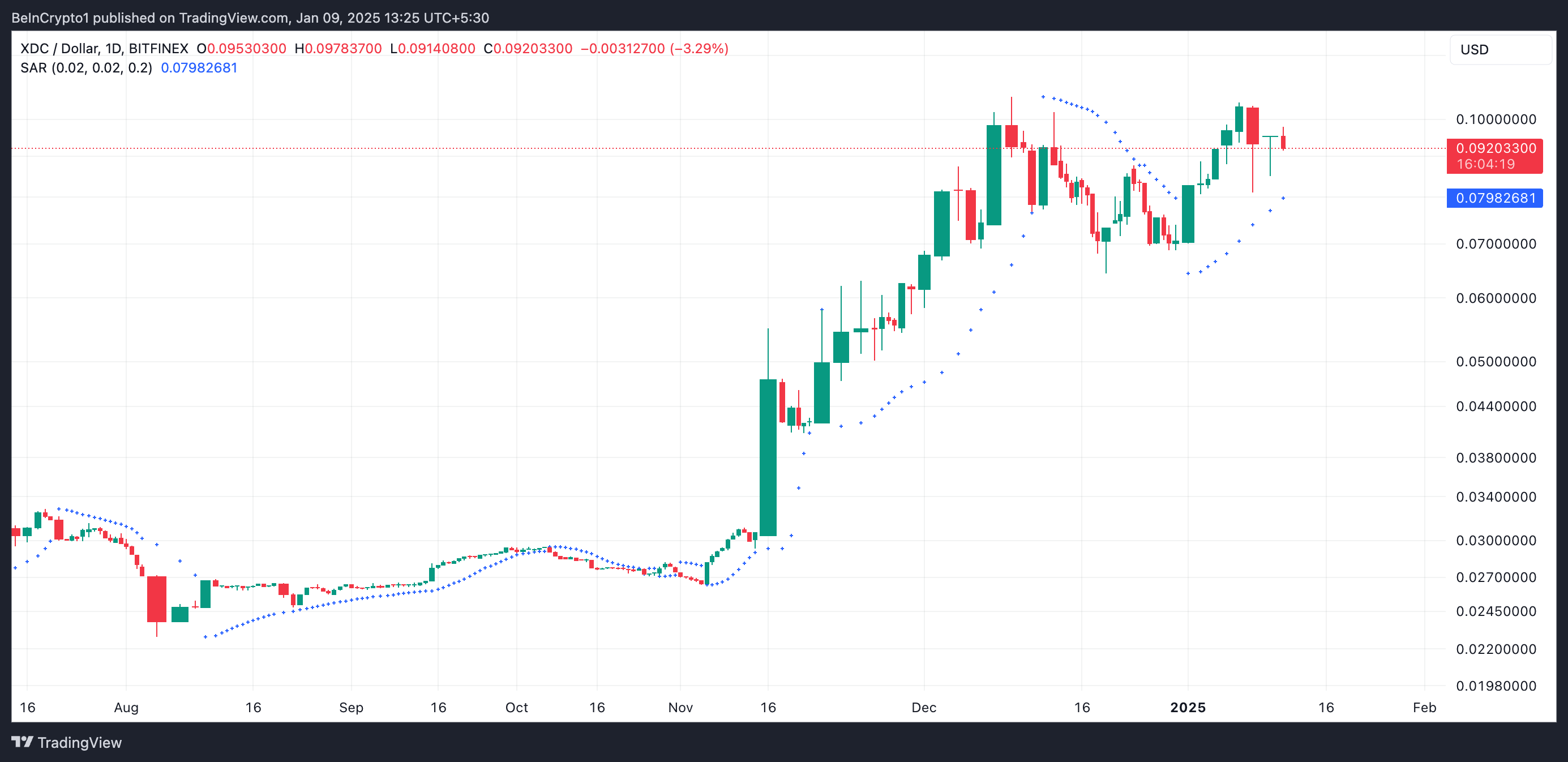 XDC handles for øyeblikket over de prikkede linjene i sin Parabolic Stop and Reverse (SAR) indikator. Denne indikatoren sporer en aktivas prisutvikling og identifiserer potensielle reverseringer ved å plotte prikker over eller under en aktivas pris.