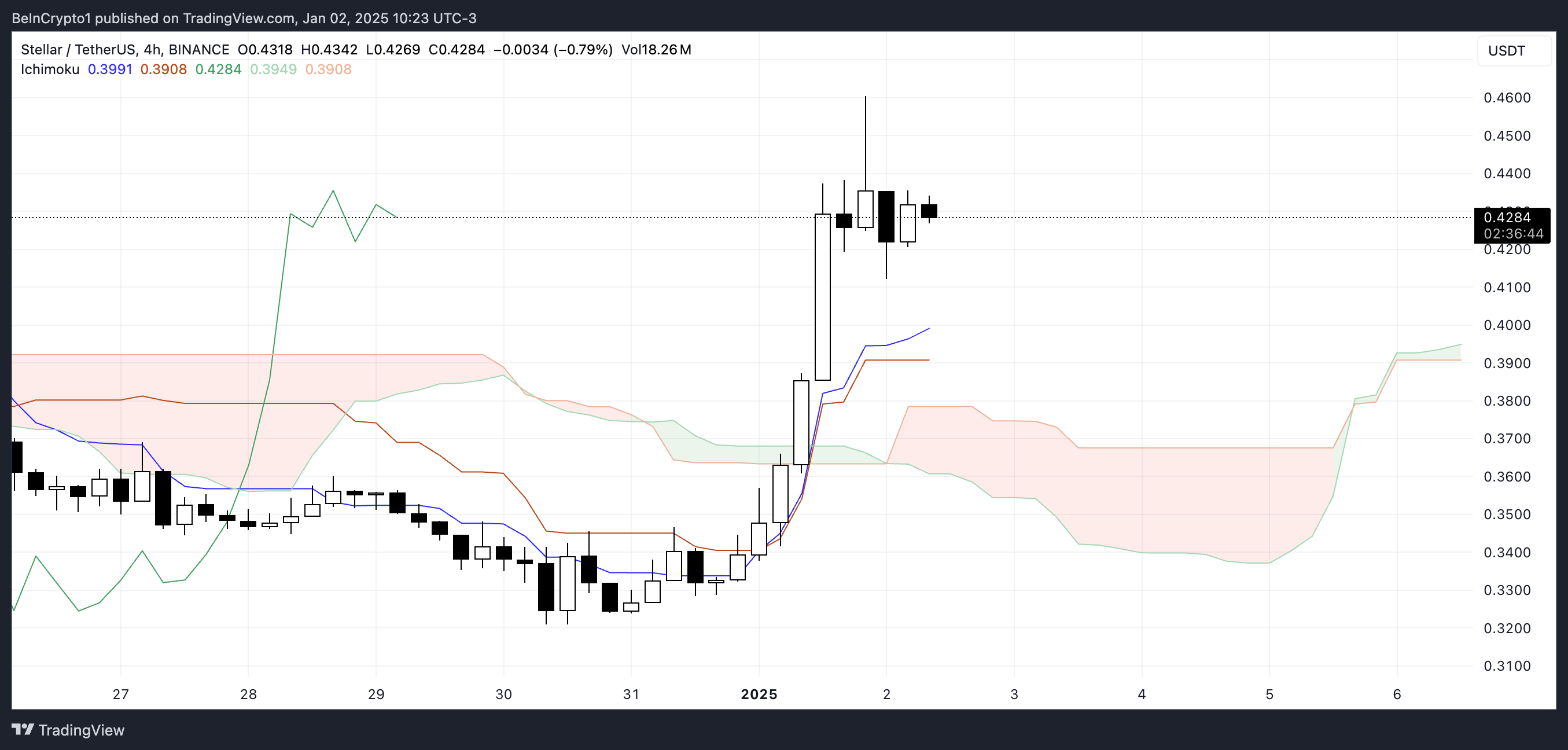 Ichimoku Cloud-diagrammet for Stellar reflekterer en sterk bullish oppsett, med prisen posisjonert godt over den røde skyen. Dette oppadgående bruddet fra skyen betyr et avgjørende skifte i momentum, med kjøpere fast i kontroll.