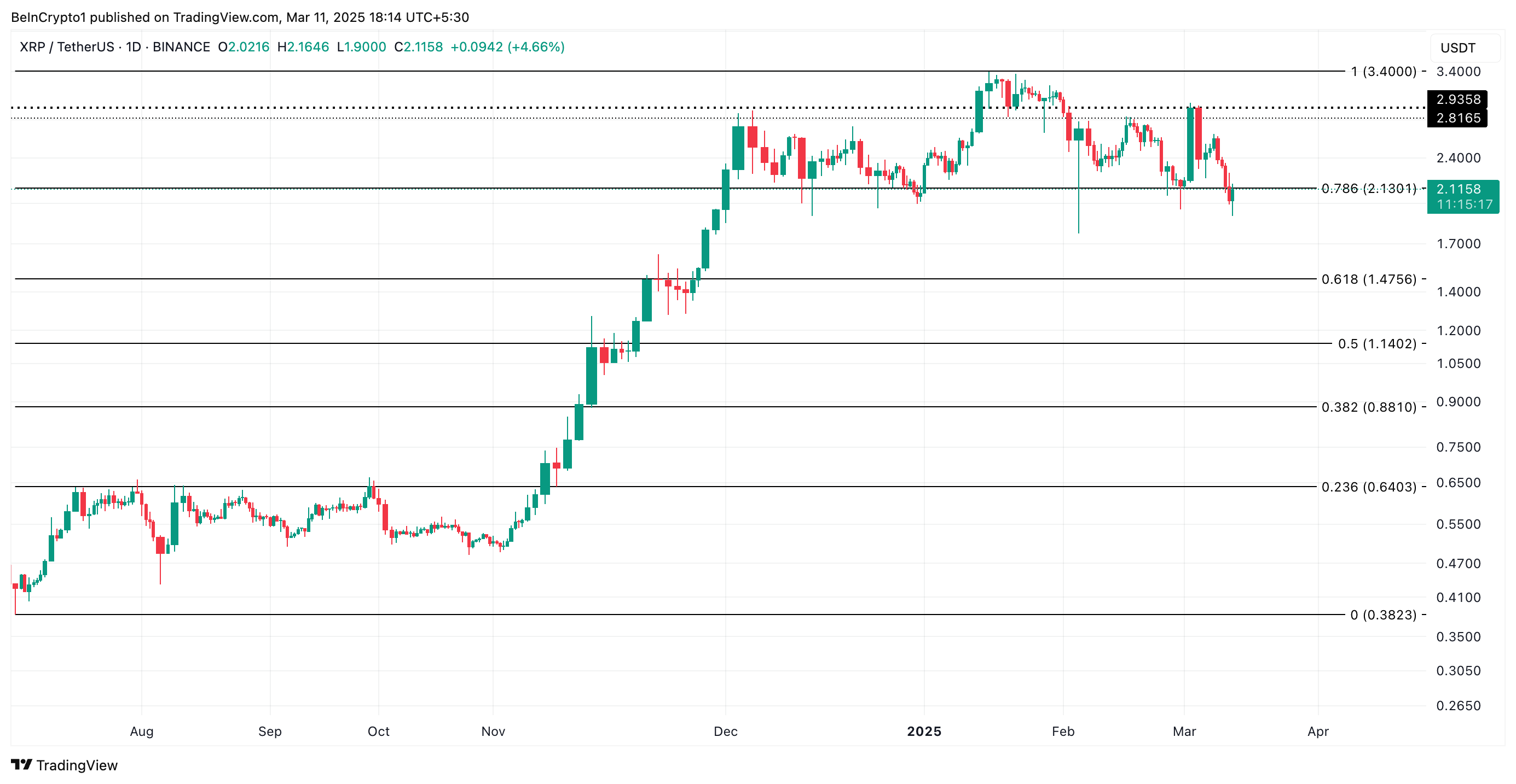 XRP risikerer å falle under $ 2 hvis ny etterspørsel forblir ubetydelig. I det scenariet kan det falle til $ 1,47, et lavpunkt det sist nådde i november.
