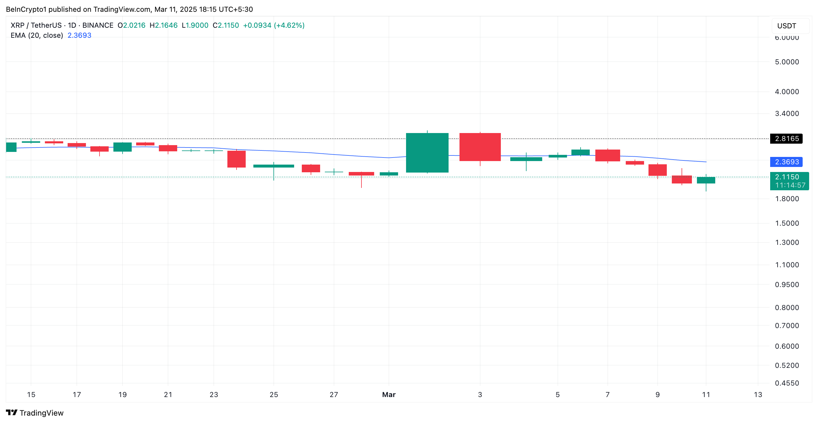 XRP handles for øyeblikket til $ 2,11, og bytter hender under sin 20-dagers eksponentielle glidende gjennomsnitt (EMA). Dette viktige glidende gjennomsnittet måler aktivets gjennomsnittlige pris over de siste 20 handelsdagene, og gir mer vekt til nylige priser for å reflektere kortsiktige trender.