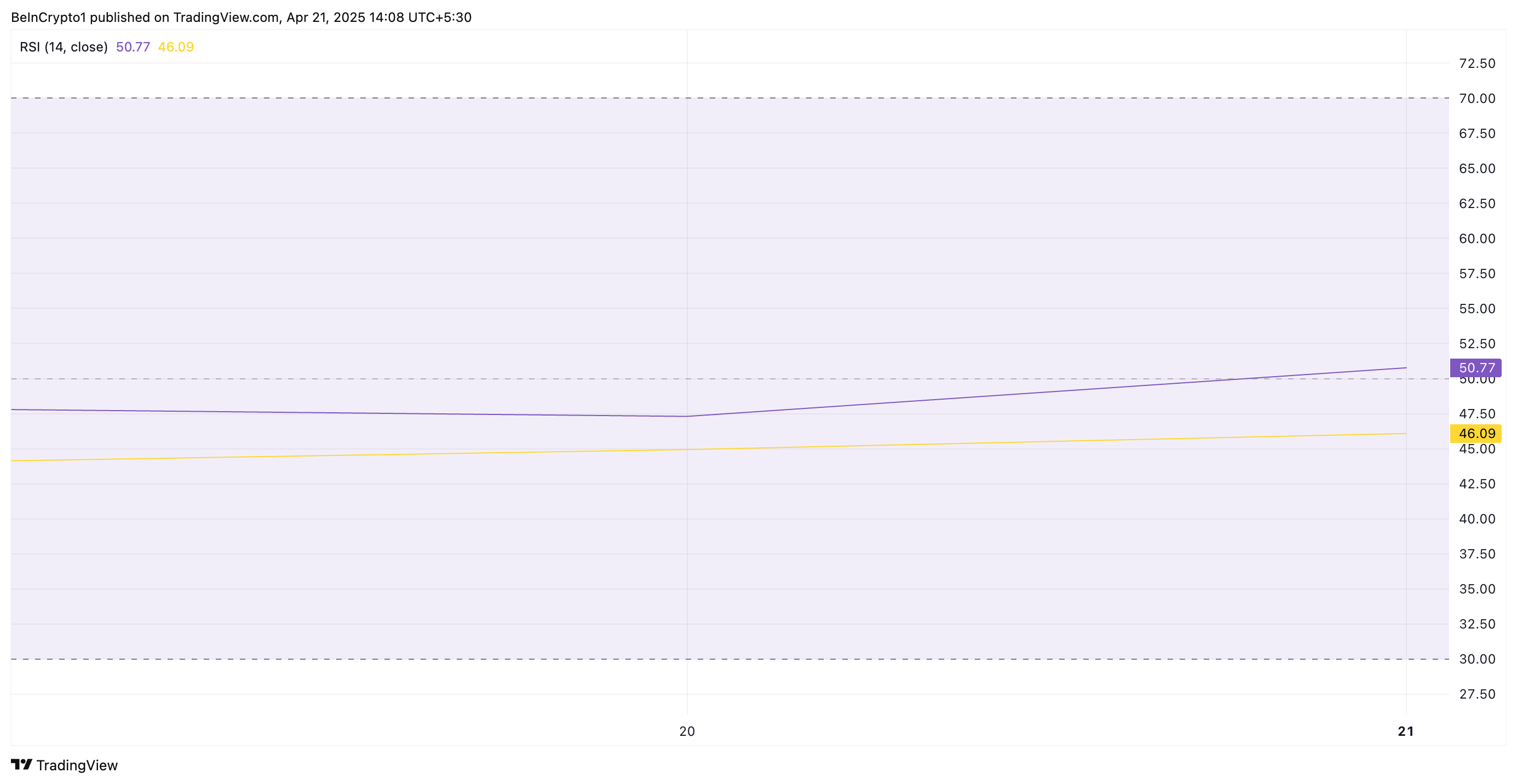 På 50,77 signaliserer XRP sin RSI et skifte mot bullish momentum. Det indikerer at kjøpspresset begynner å overgå salgspresset, og aktivaen kan være klar for ytterligere prisøkninger.