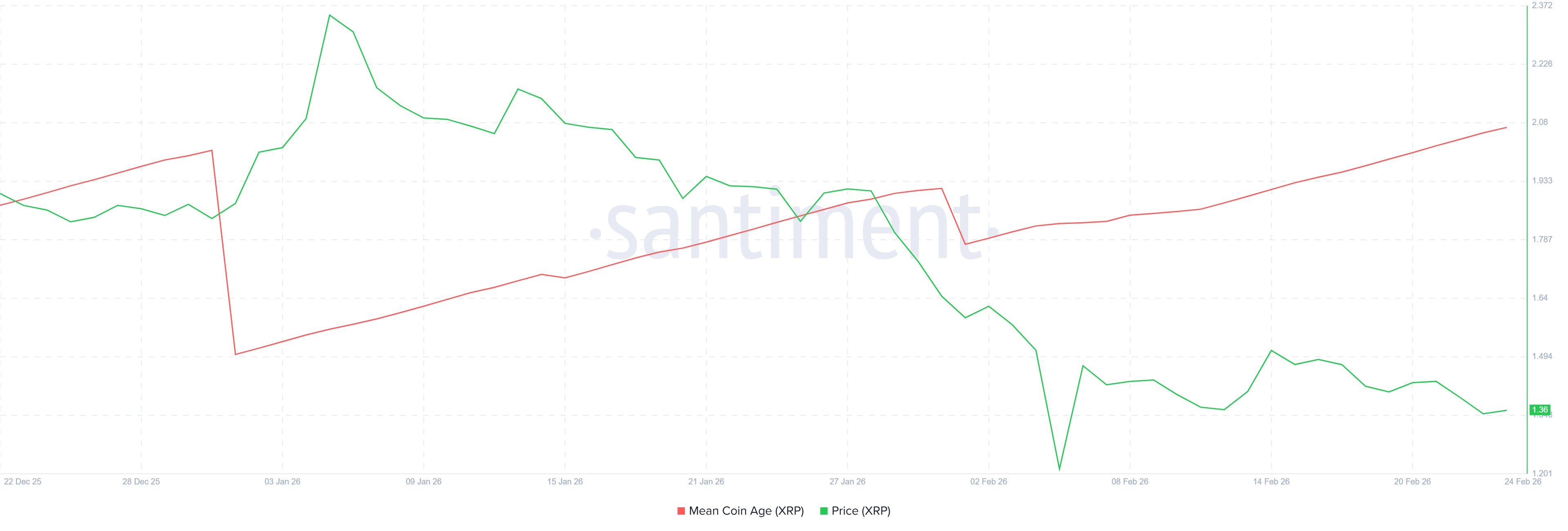 Mean Coin Age, eller MCA, gir ytterligere innsikt i holderadferd. Før en mulig oppgang ser det ut til at langsiktige XRP-innehavere foretrekker akkumulering fremfor distribusjon. Økende MCA-verdier indikerer vanligvis at mynter lagres i lommebøker i stedet for å bli brukt eller solgt.