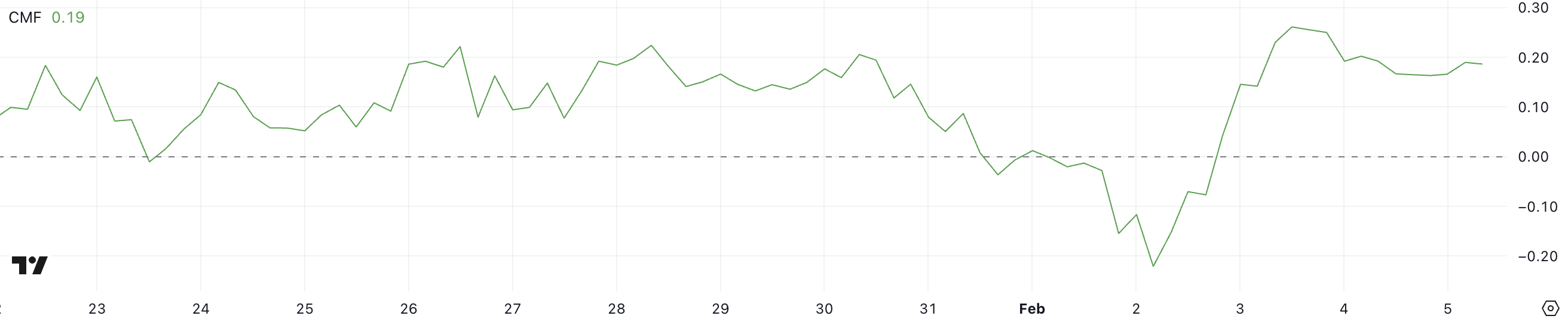 CMF er en volumvektet indikator som sporer pengestrømmen inn i eller ut av en aktiva. En positiv CMF indikerer kjøpsdominans, mens en negativ avlesning antyder salgspress. Med XRPs CMF som stabiliserer seg rundt 0,19 etter å ha falt fra 0,26, forblir kapitalinnstrømmene positive, men har avtatt.