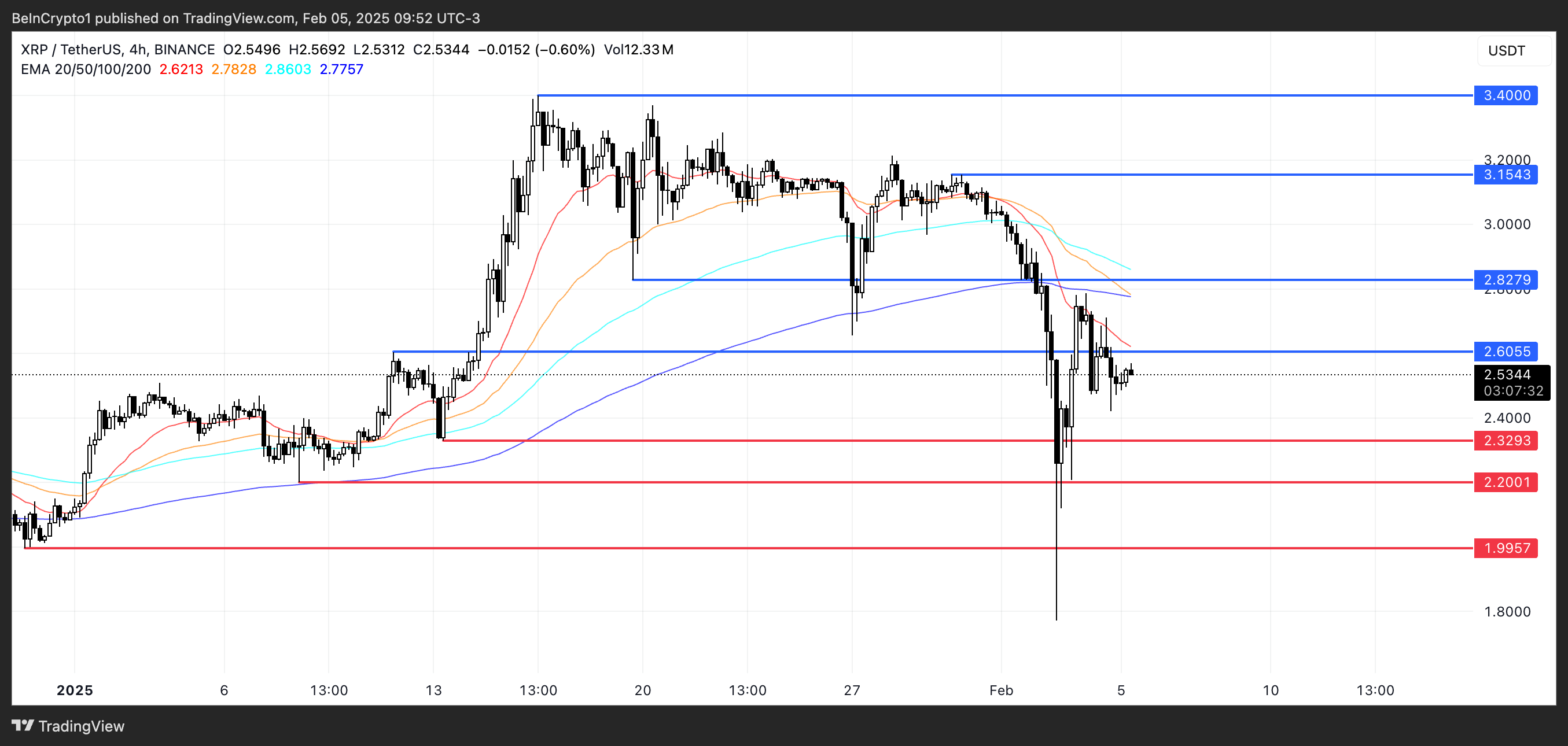 XRPs EMA-linjer indikerer at en ny death cross kan dannes snart, med en kortsiktig linje som krysser under den lengste linjen. Hvis dette bearish signalet spiller ut, kan XRP kurs teste støtten på $ 2,32, og hvis det nivået tapes, kan det falle ytterligere til $ 2,20.
