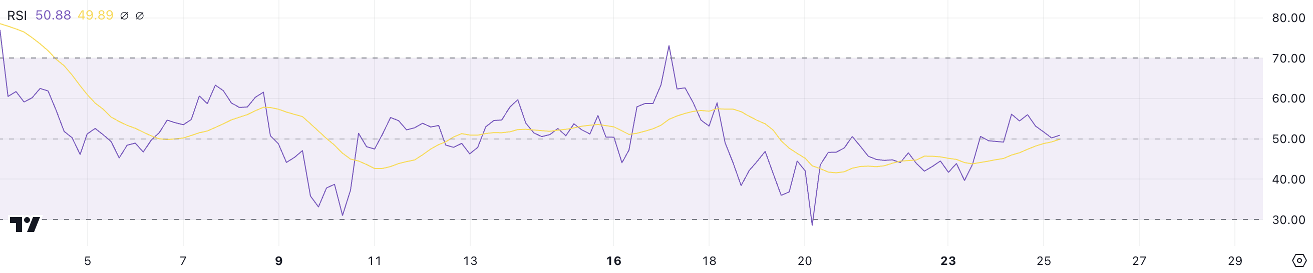 Med XRP sin RSI på 50,88 er mynten fast i den nøytrale sonen, noe som signaliserer verken overdreven kjøps- eller salgsaktivitet. På kort sikt antyder denne områdebundne RSI-oppførselen at XRP kurs kan fortsette å konsolidere med mindre en sterk katalysator dukker opp for å bryte den nåværende likevekten.