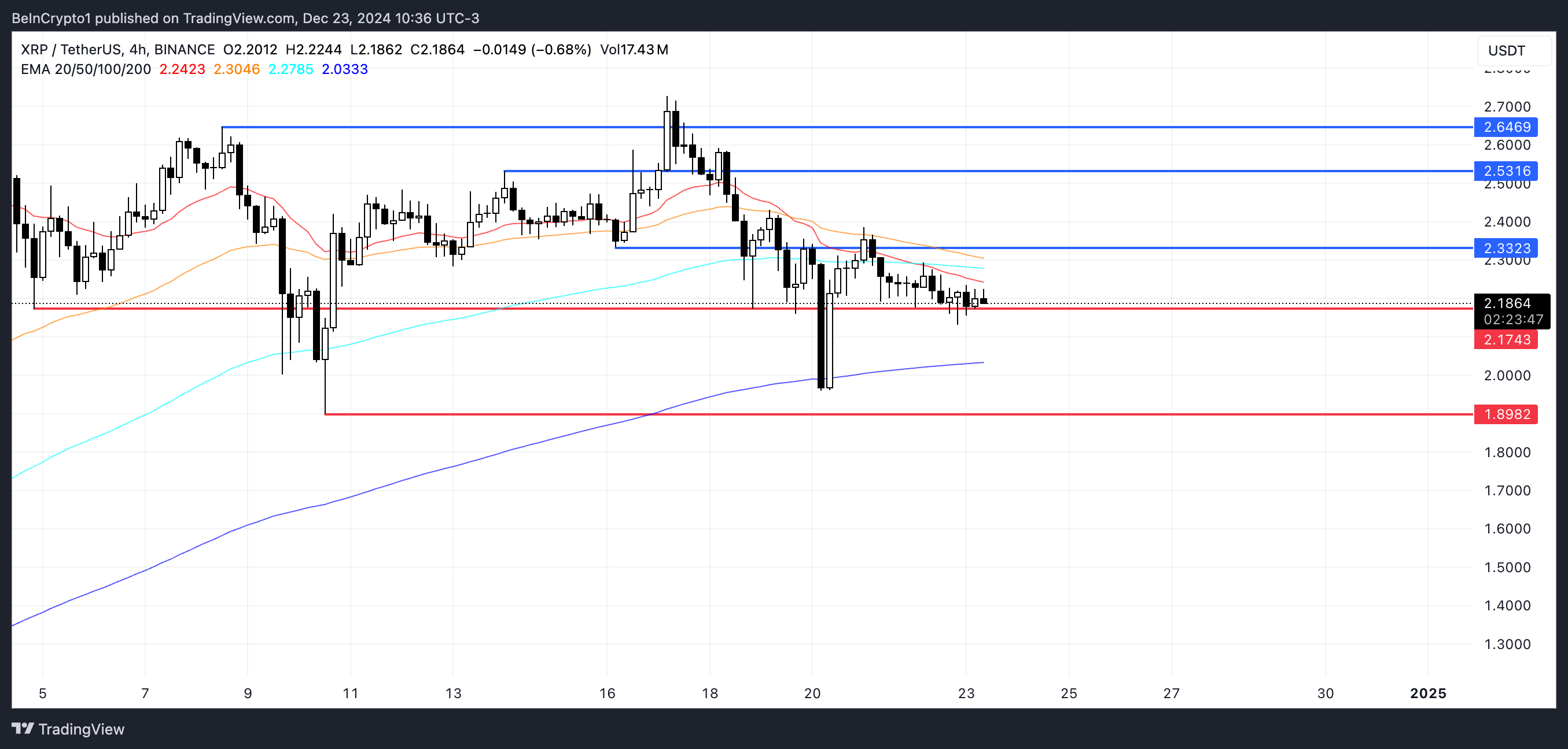 Støttenivået på $ 2,17 er kritisk for XRP nåværende prisstabilitet. Hvis dette nivået ikke holder, kan det utløse en betydelig nedadgående bevegelse, med neste sterke støtte identifisert på $ 1,89. Dette vil representere en potensiell 13 % korreksjon, noe som antyder at markedsstemningen kan bli bearish og føre til ytterligere salgspress.