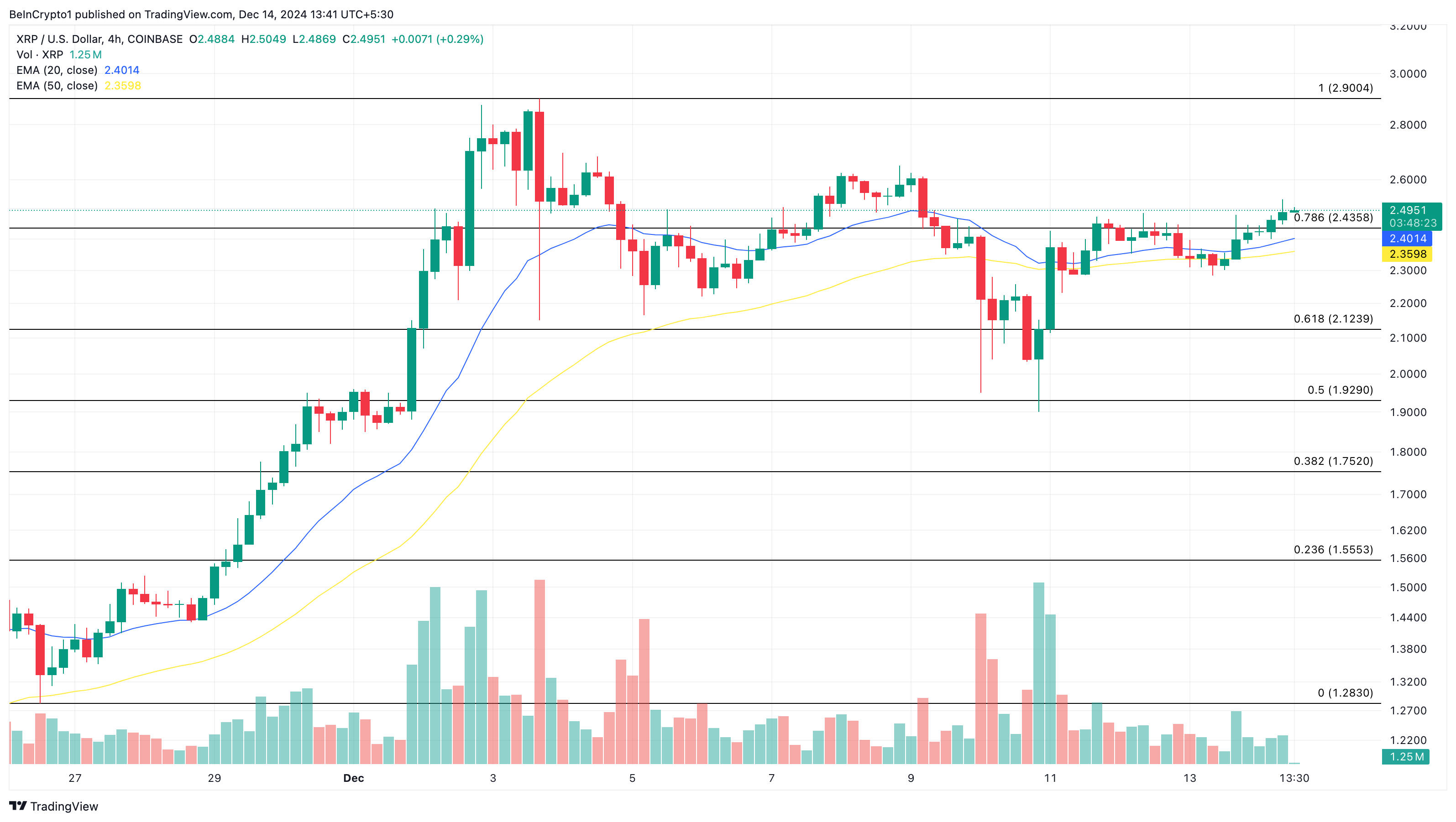 På 4-timersdiagrammet hadde XRP-kursen kortvarig falt under 20 og 50 Exponential Moving Averages (EMA) den 12. desember. EMA er en teknisk indikator som måler trender.