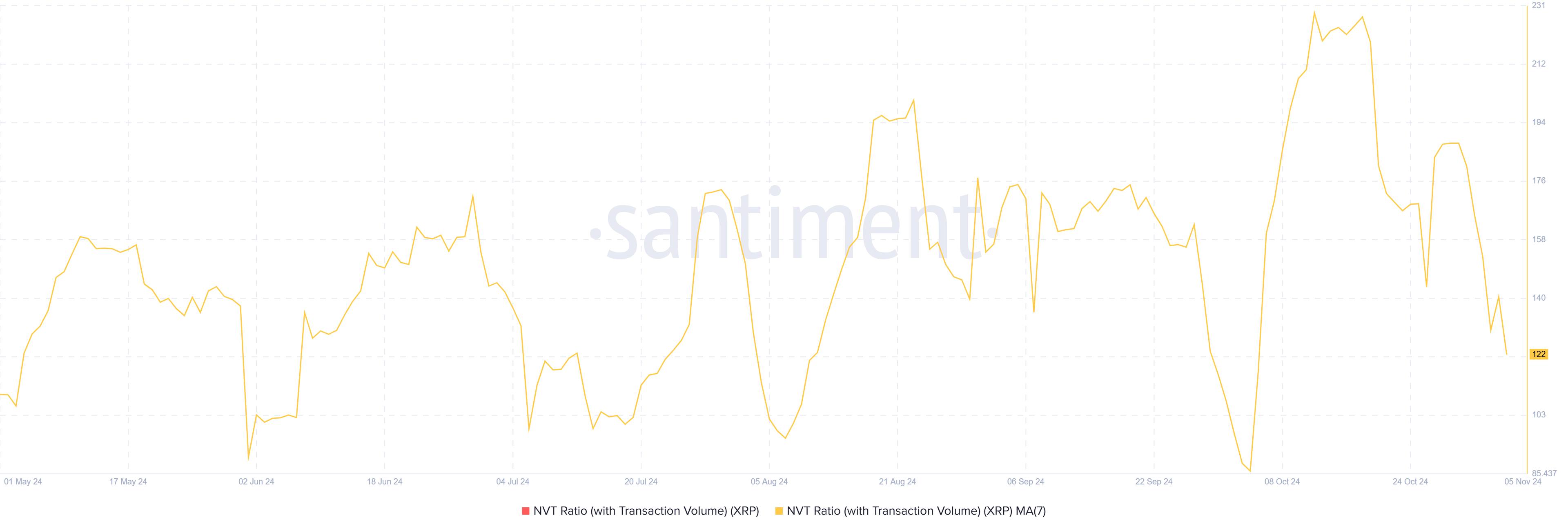 XRP sitt nettverksverdi til transaksjoner (NVT) forhold har også vært på nedgang, noe som tyder på en forbedret justering mellom nettverksverdi og transaksjonsaktivitet. Et lavere NVT-forhold reflekterer generelt sunnere nettverksdynamikk, ettersom det indikerer at XRP sin verdi er proporsjonal med dens transaksjonsaktivitet. Når NVT er høyt, risikerer aktivaen overvurdering, noe som ofte fører til korreksjoner.