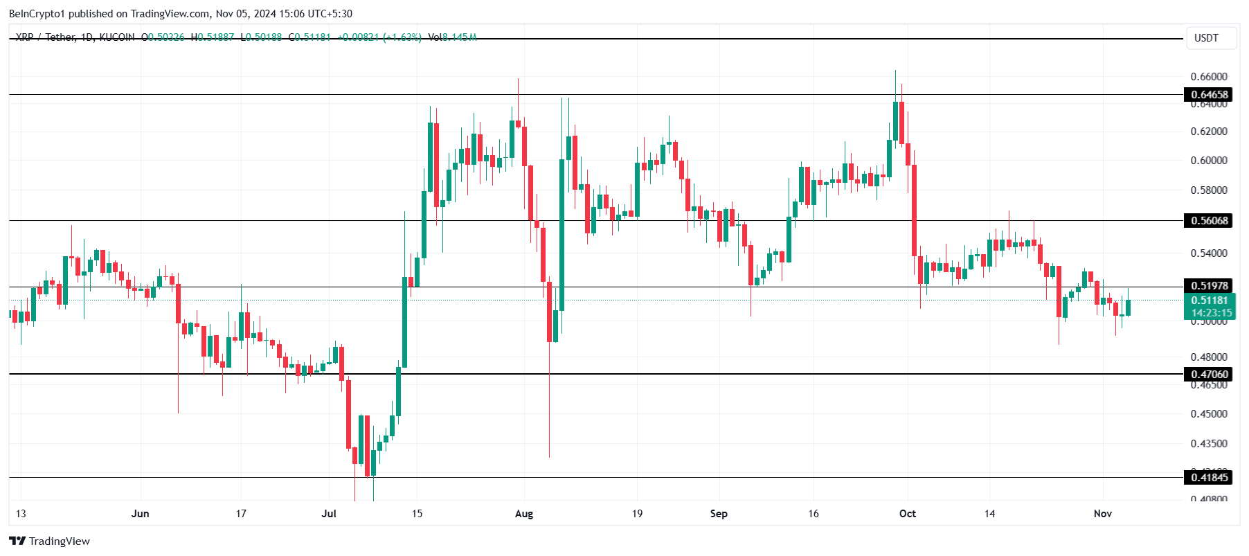 XRP handles rett under motstandsnivået på $ 0,51, som den sikter mot å snu tilbake til støtte. Selv om LTH-sentimentet er noe forsiktig, kan støtte fra andre investorer hjelpe til med å gjenetablere dette nivået. Å gjenvinne $ 0,51 som støtte kan gi en plattform for ytterligere gevinster, potensielt drive XRP mot $ 0,56 og videre.