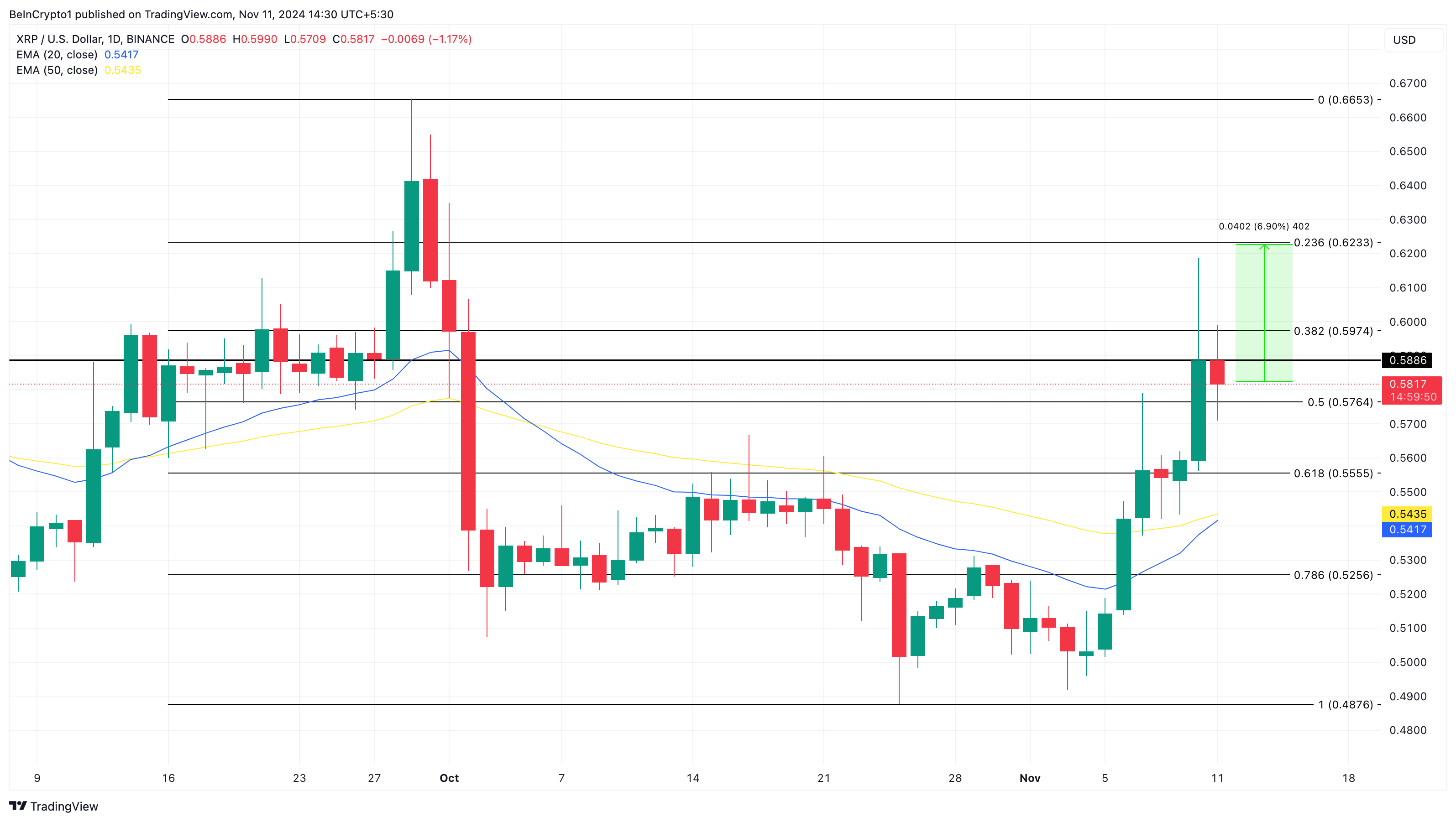 • Hvis XRP holder seg over sine 20- og 50-dagers EMAs, kan den stige 7 % til $ 0,62; men en endring i likviditet kan føre til et fall til $ 0,55.