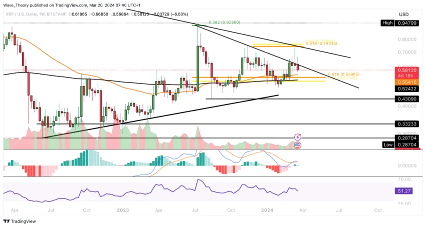 For øyeblikket møter XRP betydelig Fibonacci-støtte, som ligger rundt $ 0.52. I tillegg gir det 50-måneders eksponentielle glidende gjennomsnittet (EMA) supplerende støtte på dette nivået.