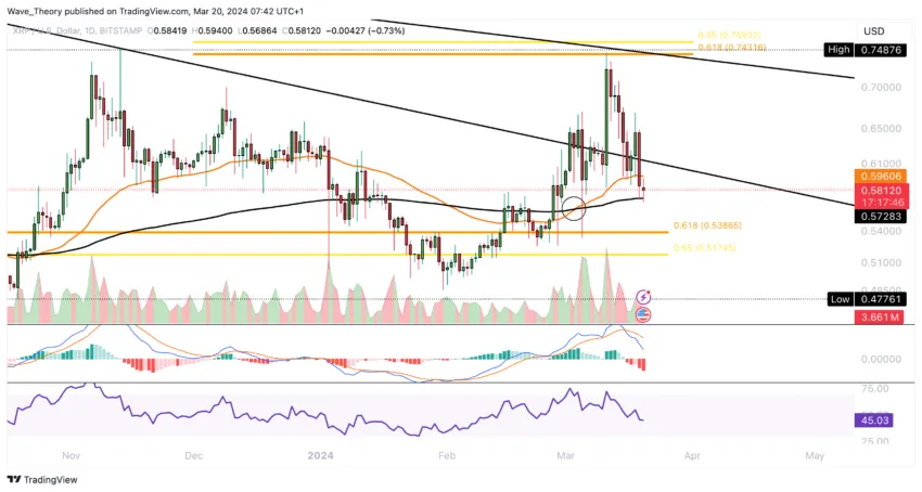 Denne måneden nærmet XRP-prisen seg det kritiske motstandsnivået for Golden Ratio på rundt 0,75 dollar. Imidlertid møtte den betydelig avvisning på dette tidspunktet.