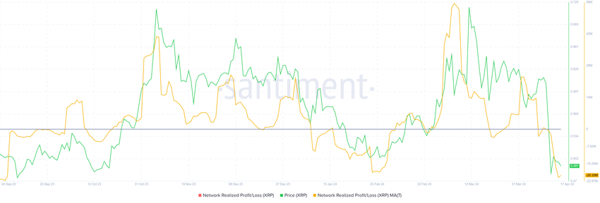 Det var forventet at XRP-prisen skulle ta en vending til det verre, gitt at den fulgte et bearish mønster. Investorene har imidlertid vist motstandsdyktighet ved å velge å ikke selge sine beholdninger. Nettverkets indikator for realisert fortjeneste/tap viser at investorene i stor grad opplever tap etter prisnedgangen.
