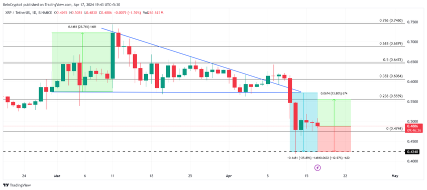 Nedgangen i XRP prisen var en del av det fallende trekantmønsterets bearish utfall. En korreksjon på 25 % var sannsynlig i henhold til mønsteret, noe som ville ha sendt Ripple-tokenet til 0,42 dollar. Altcoin stoppet imidlertid nedgangen på $ 0,47.