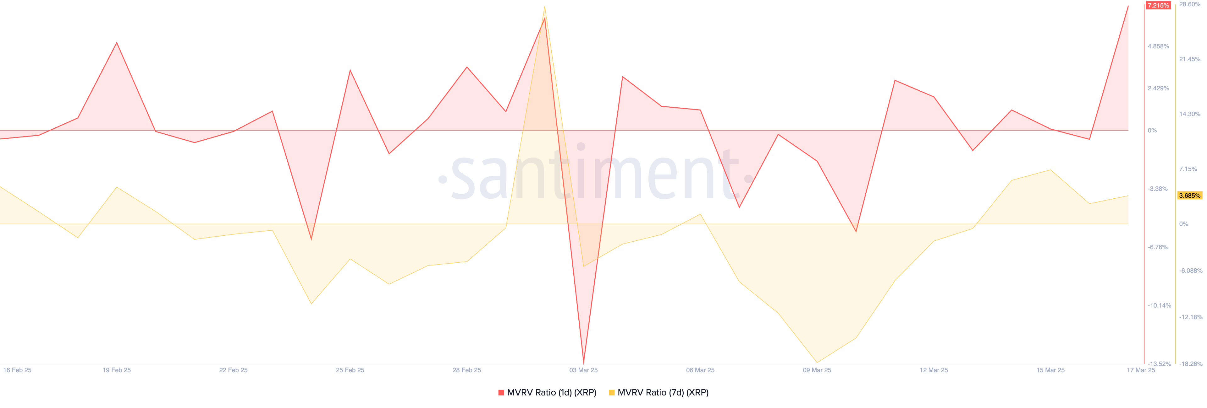 En viktig indikator som blinker varselsignaler er XRPs Market Value to Realized Value (MVRV) ratio. Denne metrikken, målt ved bruk av ett-dags og syv-dagers glidende gjennomsnitt, står for øyeblikket på henholdsvis 7,21 % og 3,68 %.