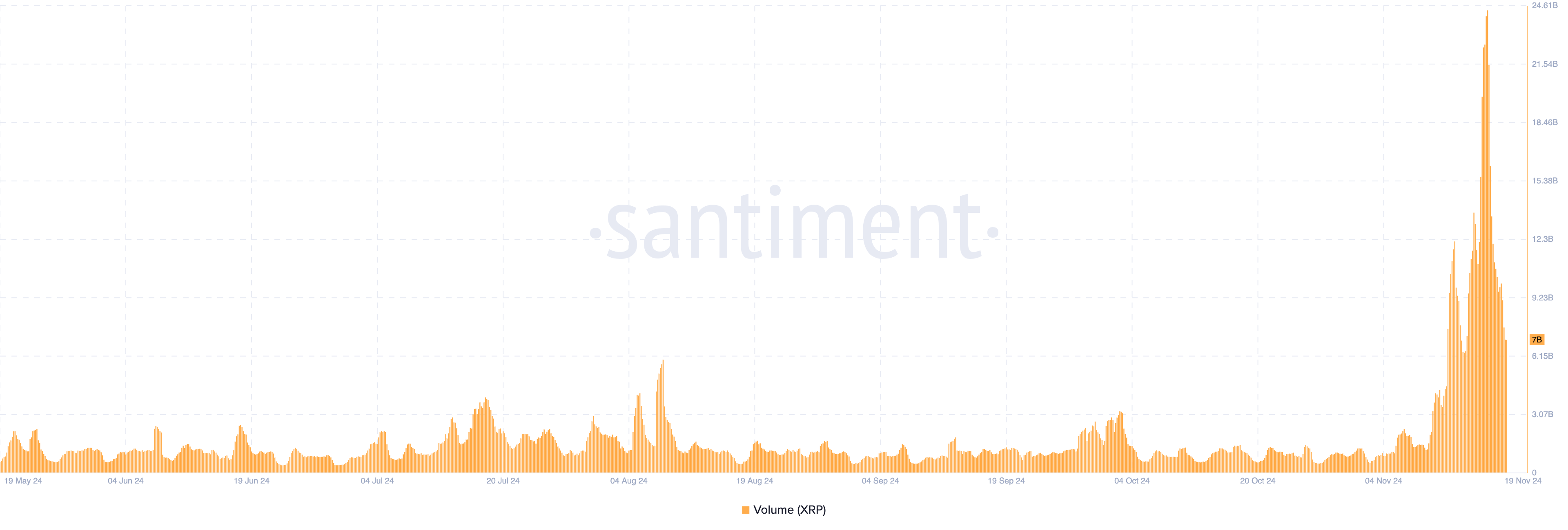 Ifølge Santiment nådde XRPs volum nylig en topp på $ 24,40 milliarder, men har siden falt betydelig til $ 7 milliarder, noe som markerer et fall på $ 17 milliarder i kjøps og salgsaktivitet.