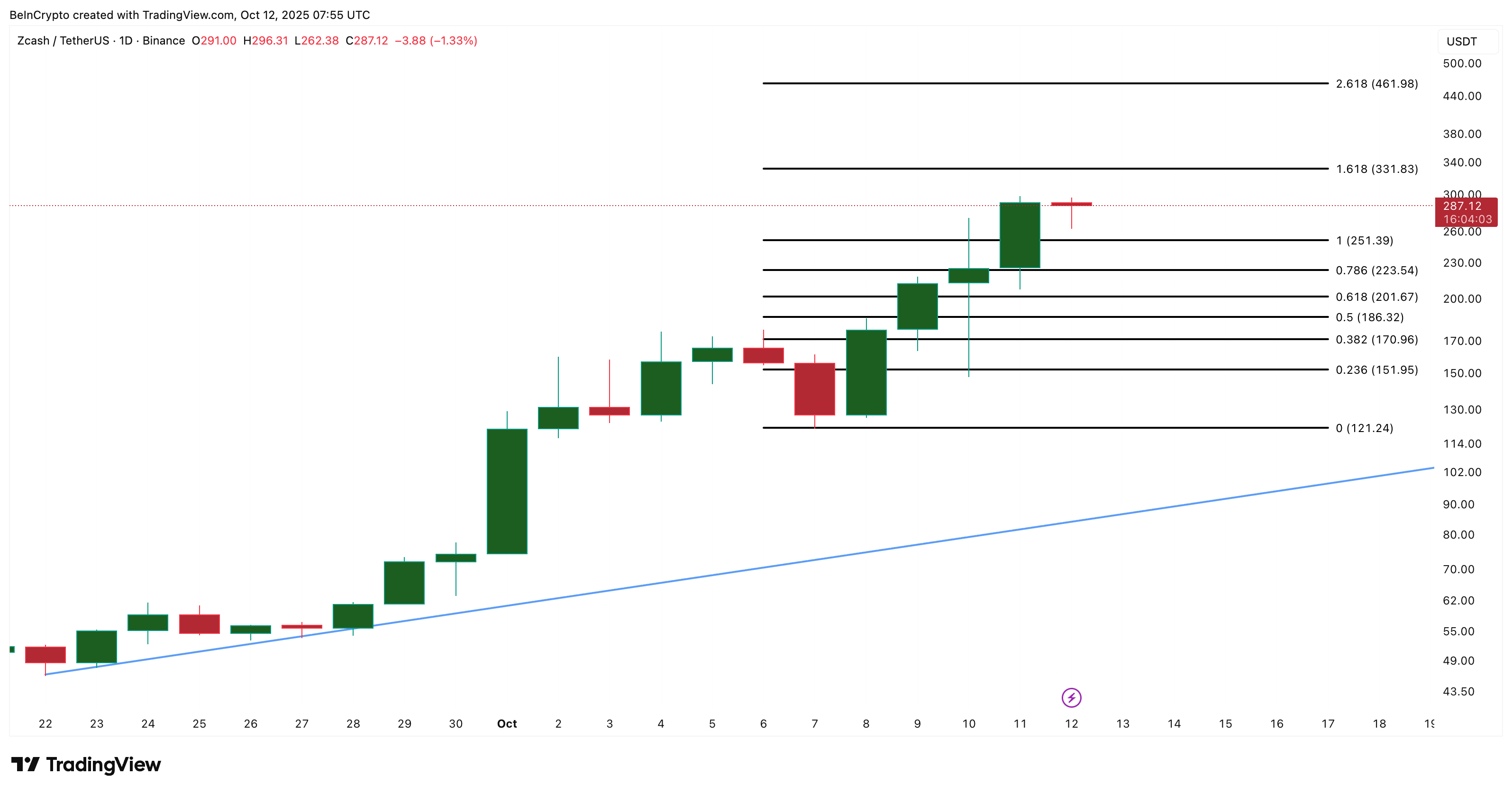 Zcashs daglige diagram viser at rallyet fortsatt er teknisk solid. Tokenen fortsetter å handle innenfor en stigende trekant, med Fibonacci-nivåer som gir sterk struktur. I skrivende stund ligger ZEC rundt $ 287, med umiddelbar støtte nær $ 251.