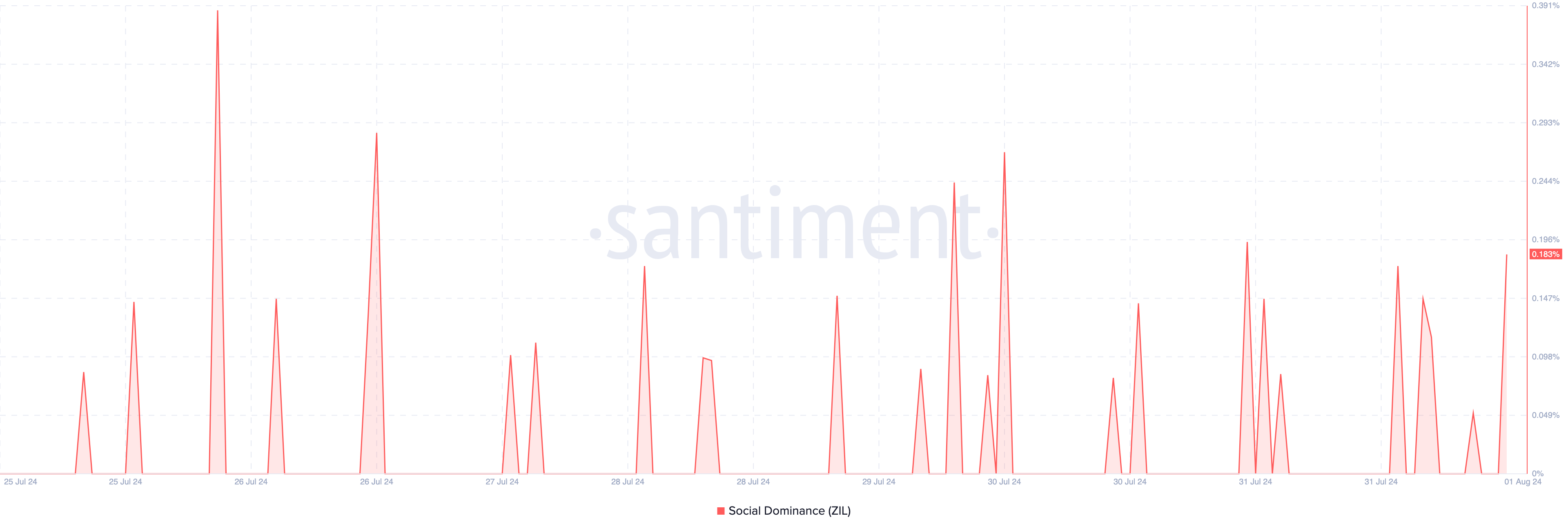 Til tross for nedgangen, har Zilliqas sosiale dominans økt. Den sosiale dominansmålingen sammenligner raten av diskusjoner rundt en kryptokurrency med den for andre prosjekter.